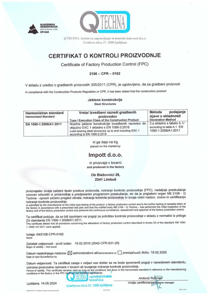 Certifikat za jeklene konstrukcije v skladu z en 1090-2