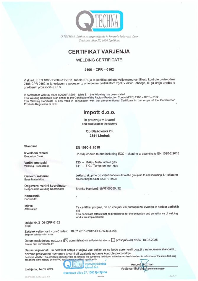 Certifikat, ki smo ga pridobili že leta 2015, je dokaz o mehanski odpornosti in stabilnosti jeklenih konstrukcij, ki sta predpogoj za varnost ter zanesljivost vseh naših izdelkov. Prav tako skrbimo za redno atestiranje varilcev. Kakovosti v proizvodnji našim strankam zagotavlja, da dobijo prav tisto, kar pričakujejo. S kvaliteto izdelkov pa ohranjamo tudi kvaliteto podjetja.